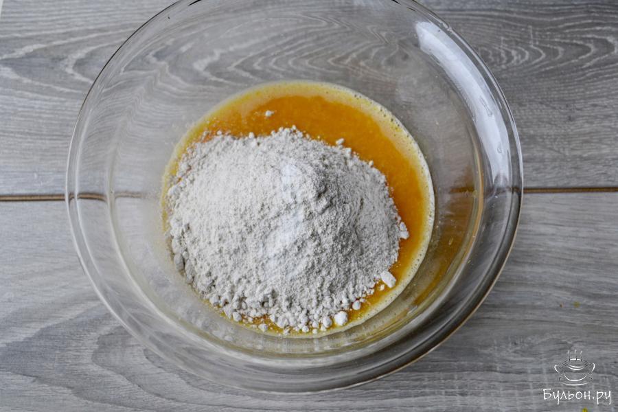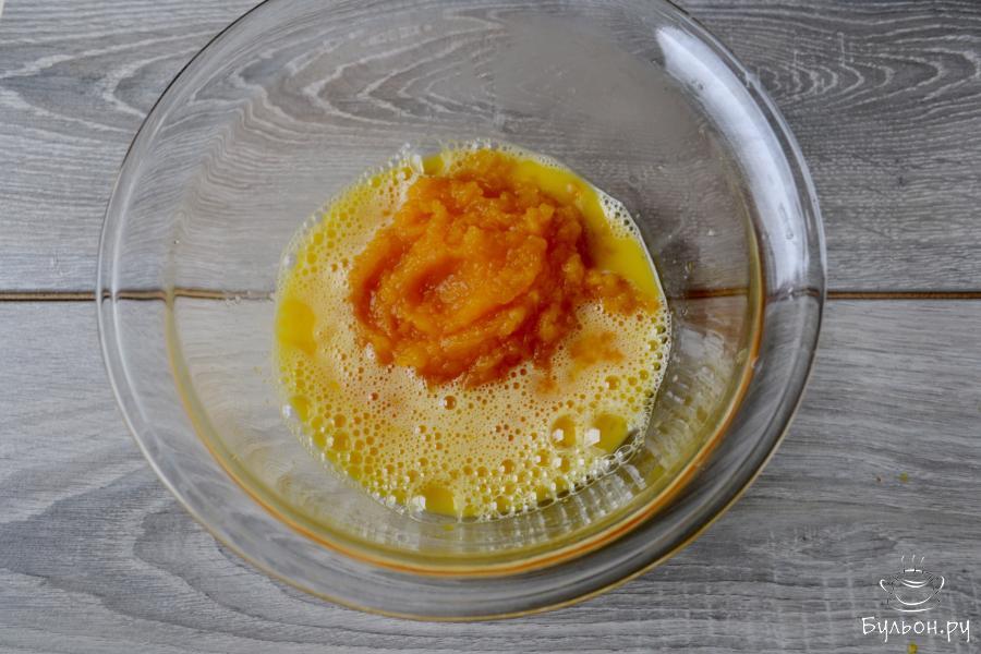 7. Вмешать муку в жидкую основу. Должно получится довольно густое тесто. Муки может понадобиться немного другое количество, чем указано в рецептуре. Будет зависеть от сочности тыквы и категории яиц.