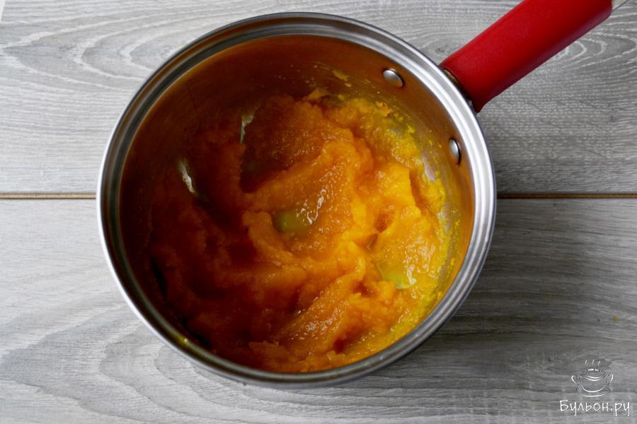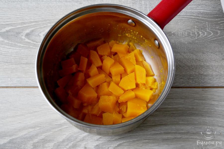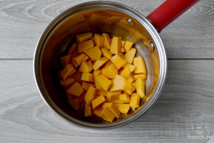 1. Тыкву очистить, нарезать на небольшие кусочки, положить в сотейник, залить водой так, чтобы только покрыла кусочки.