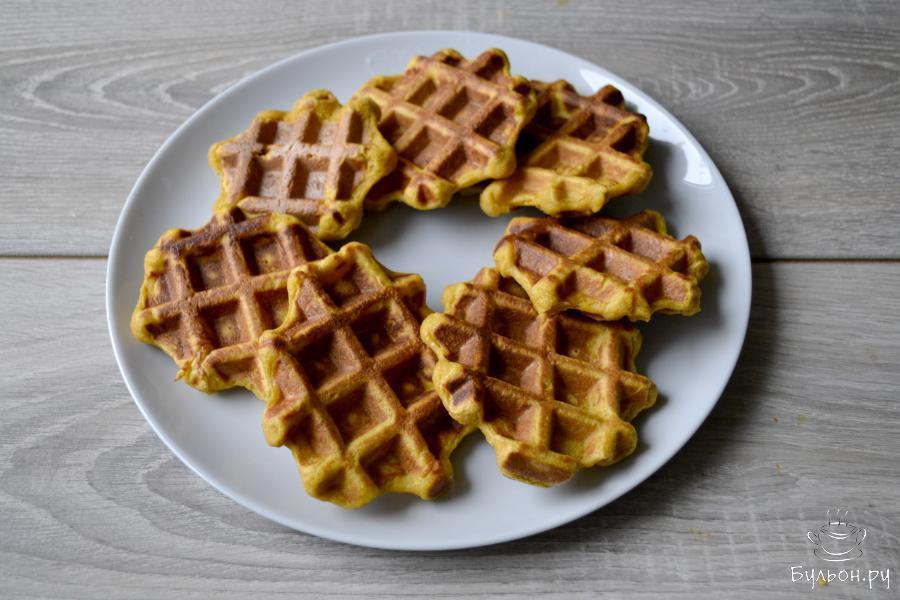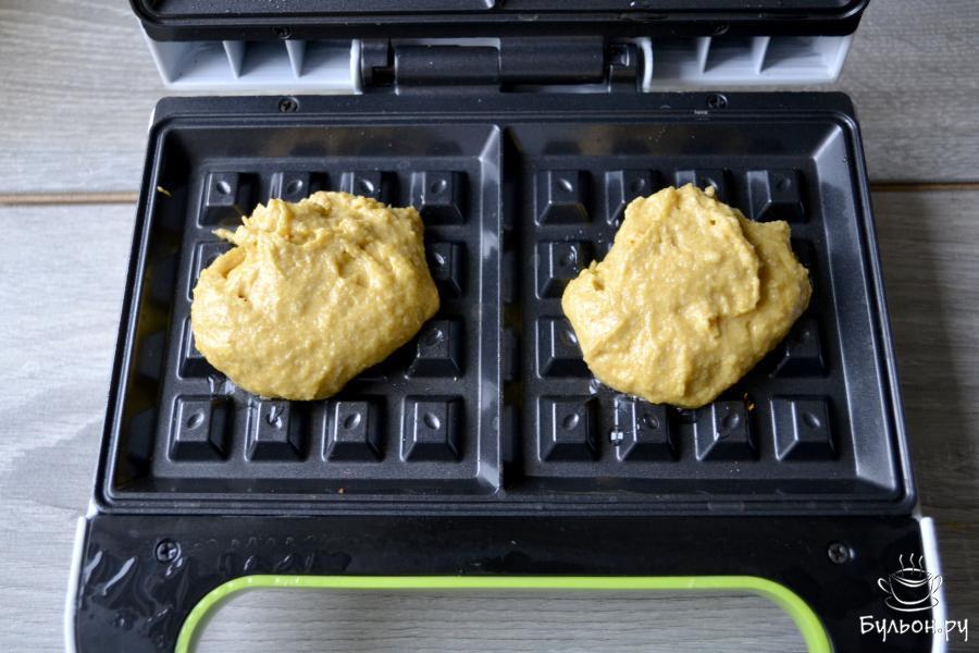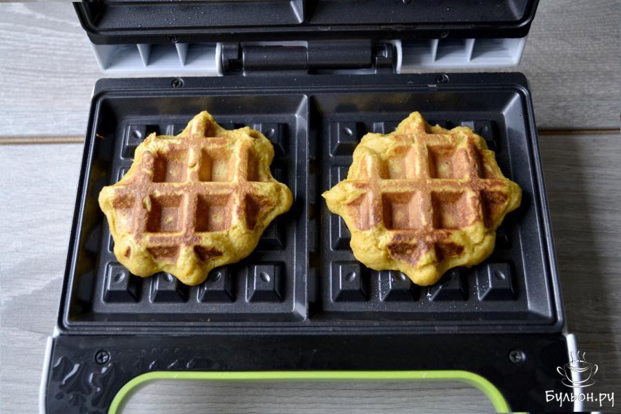 9. Выпекать вафли примерно 5-7 минут. Время выпечки будет зависеть от мощности вашего прибора. Готовые вафли должны иметь румяную корочку и легко сниматься с панели вафельницы.