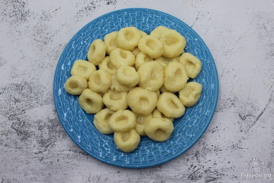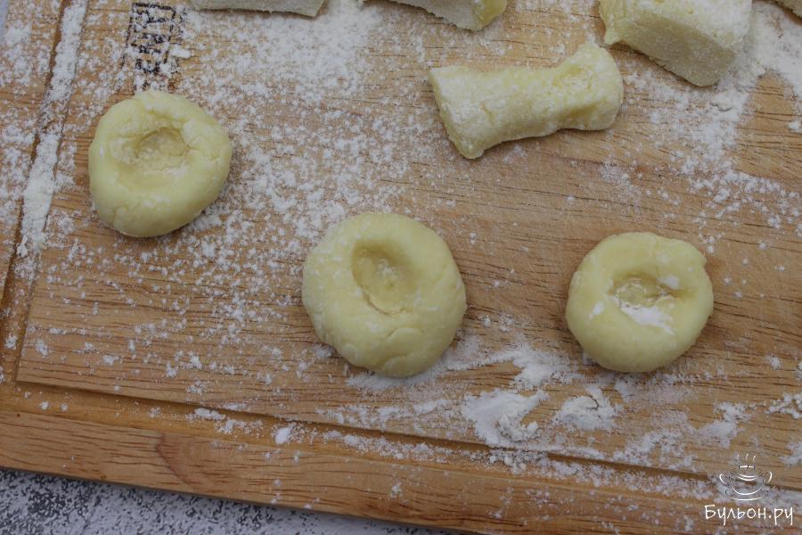 5. Каждый кусочек скатать в шарик и, обмакнув указательный палец в крахмал, надавите в середину каждого шарика, как бы приплюснув его.