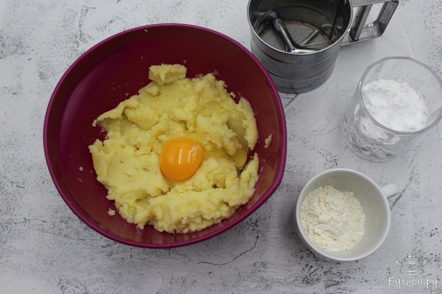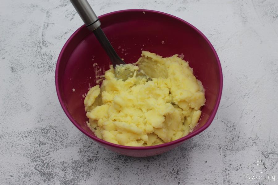 2. Когда картофель будет готов, воду слить и дать немного ему остыть. После чего размять картофель в пюре.