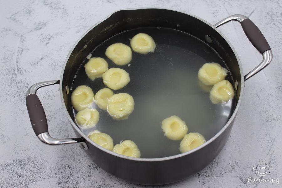 6. В кипящую подсоленную воду всыпать подготовленные клецки и дать им время всплыть. Чтобы клецки не слипались друг с другом, лучше варить их частями либо в очень большой кастрюле.