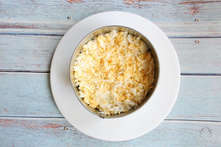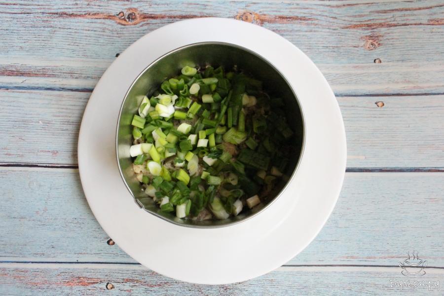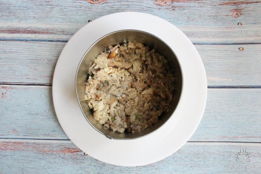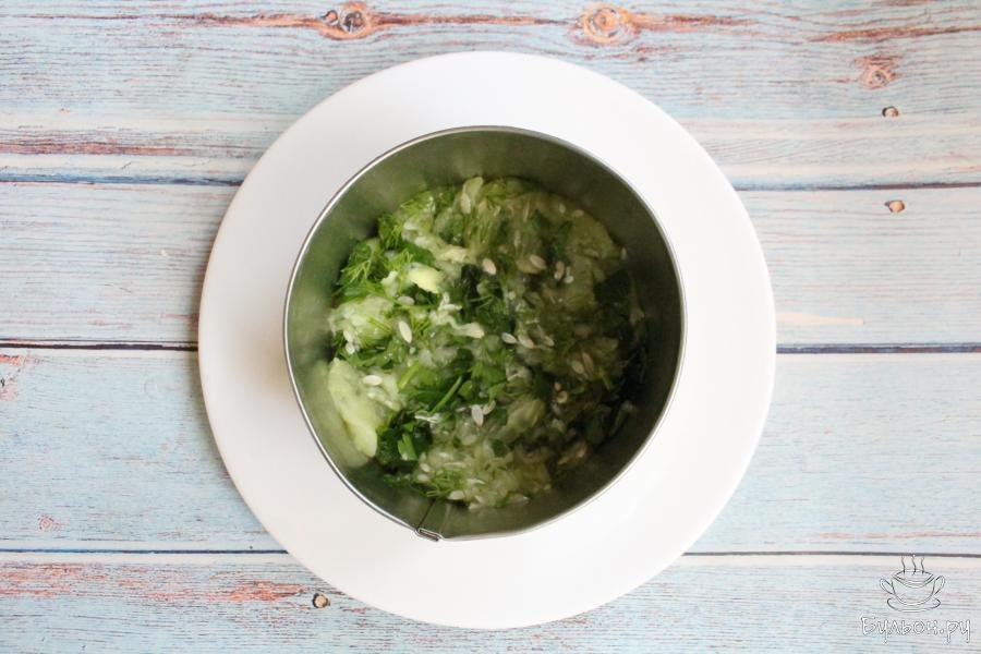 2. Если от огурцов будет много сока, то его нужно слить. Выложить овощную массу в кольцо для салата.