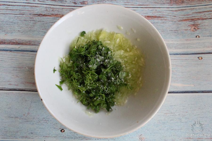 1. Огурцы промыть, почистить и перетереть через крупную терку. Укроп и петрушку промыть, обсушить, мелко нарезать, добавить к огурцам. Посолить и перемешать овощную массу.