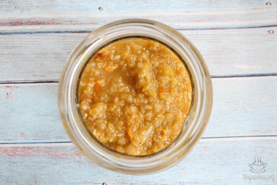 9. Выложить горячий соус в банку. Если готовить соус на зиму, то закрыть банку закручивающейся крышкой, перевернуть банку и укутать на сутки. Затем убрать в кладовую. Если готовить соус на каждый день, то убрать его в холодильник.