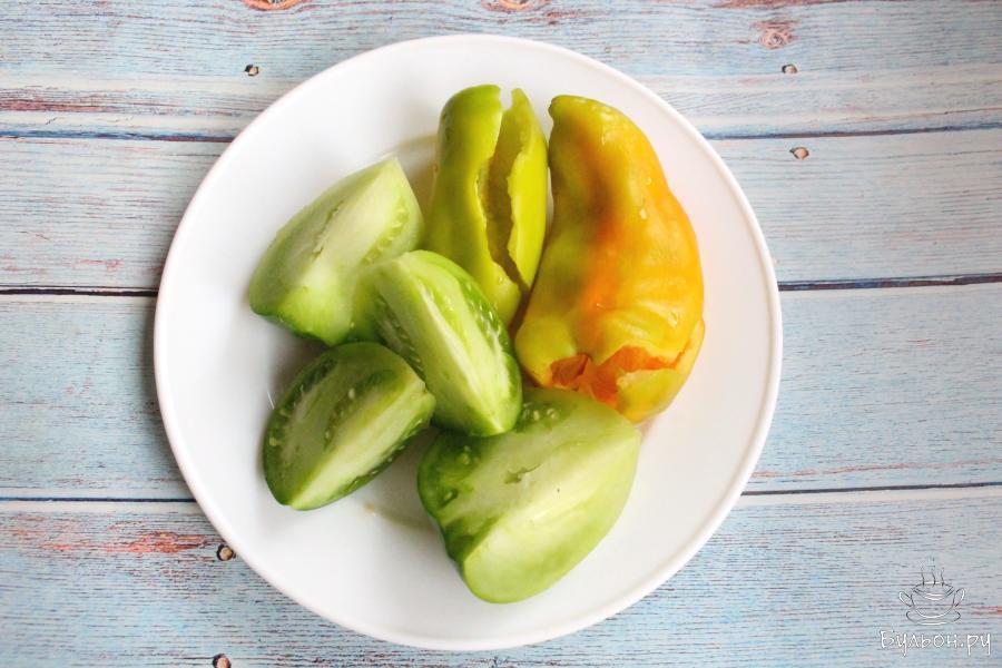 2. Зеленые болгарские перцы почистить от семечек и промыть. Зеленые помидоры промыть и нарезать произвольно.