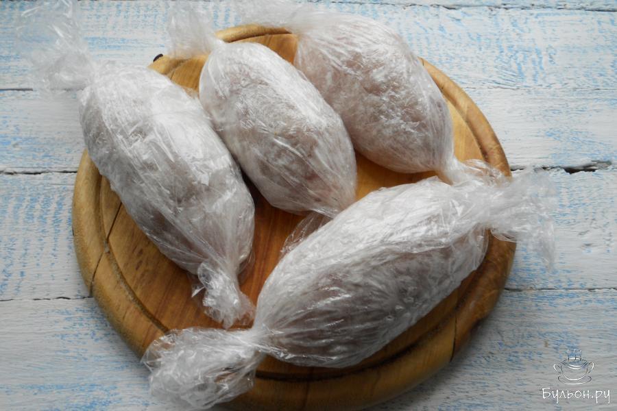 11. Таким же способом подготовить все котлеты и завернуть каждую - в пищевую пленку. Поместить котлеты в морозильник на 30-40 минут.