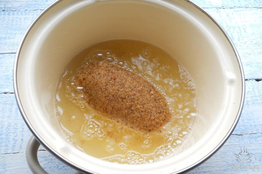16. В кастрюле разогреть растительное масло и жарить котлеты до румяности. Если масло не полностью покрывает котлету, ложкой нужно подливать кипящее масло сверху.