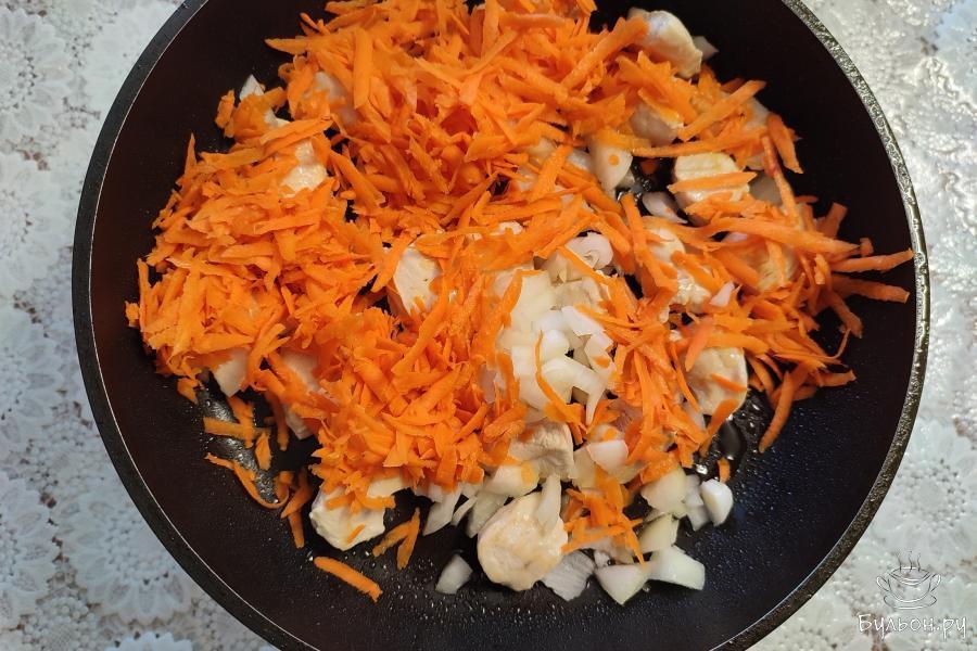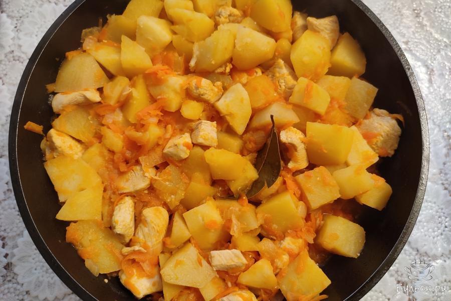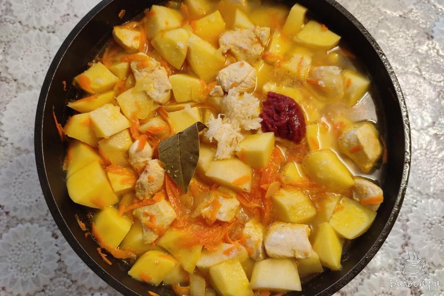 7. Налить воду, посолить, добавить лавровый лист, томатную пасту и мелко натертый чеснок. Размешать и накрыть крышкой.