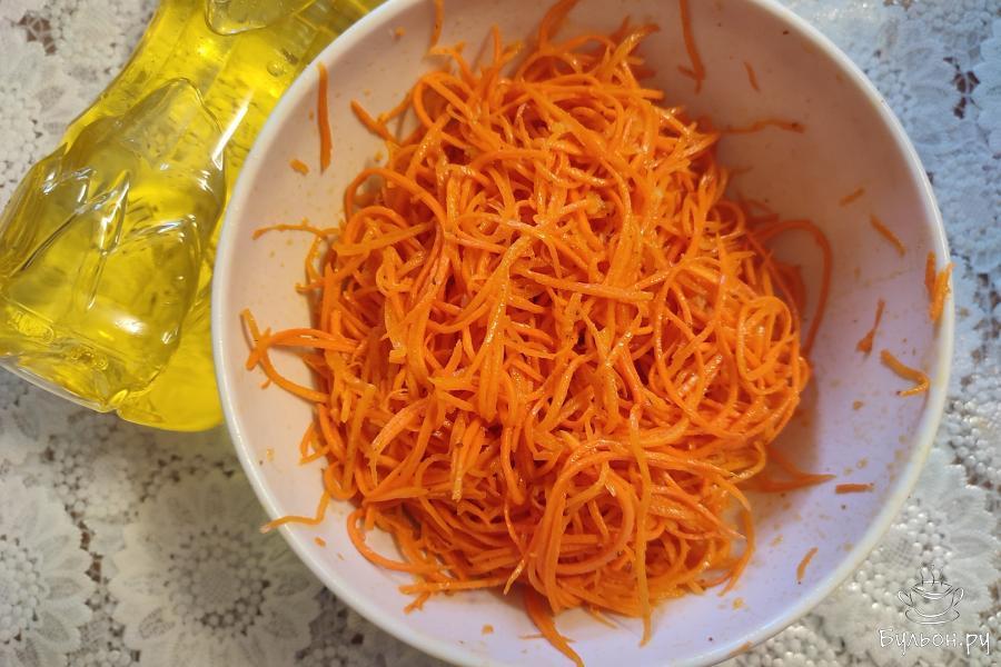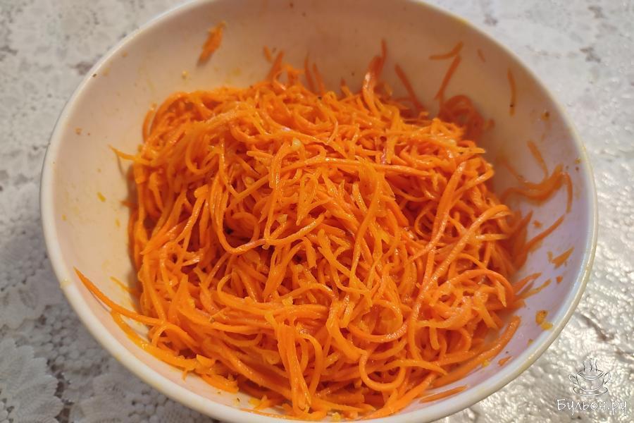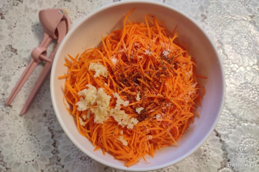 2. В подходящую посуду выложить измельченную морковь, приправу для моркови по-корейски, щепотку соли и мелко натертый чеснок.