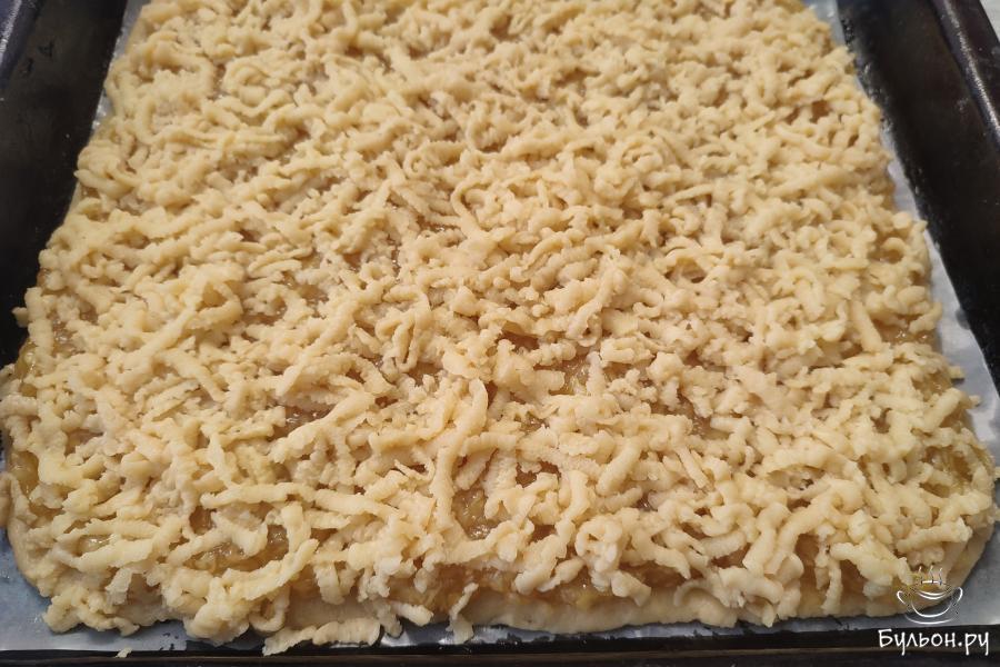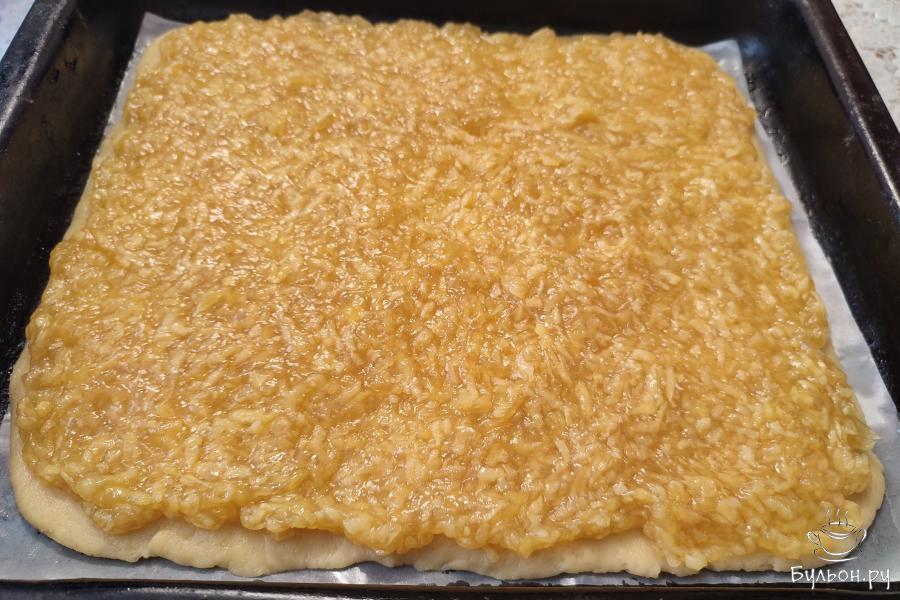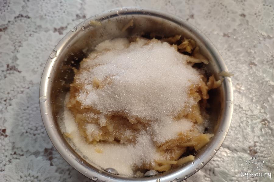 4. Для начинки натереть очищенные яблоки с помощью крупной терки. Смешать яблоки с 50 г сахара и проварить несколько минут до появления сока.