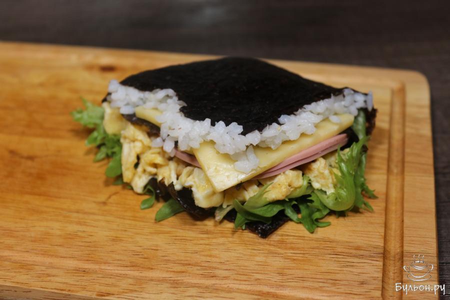 Приготовив сэндвич в японском стиле, вы сделаете одновременно сытный, полезный, питательный, а главное вкусный прием пищи. Приготовив такой сэндвич, кушайте его сразу, поскольку нори обмякнут, перестанут быть хрустящими, а ведь это одно из изюминок данного рецепта. Советую такой сэдвич кушать с соусами или кетчупом. Взяв данный рецепт за основу, можно нафантазировать еще много разновидностей сэндвичей: они могут быть и с тунцом, и с лососем, и со сливочным сыром, и с курицей и т. д.