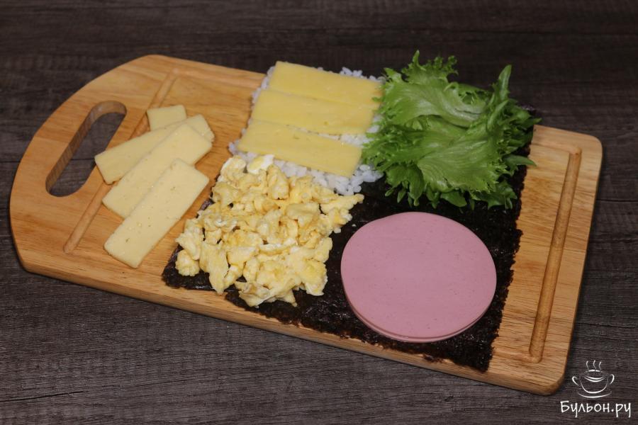 4. Собрать сэндвич. На каждую из четвертинок выложить рис с кусочками сыра, яичные кусочки, 2 ломтика колбасы, 2 листика фрилиса.