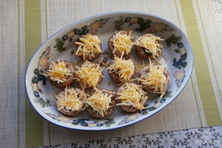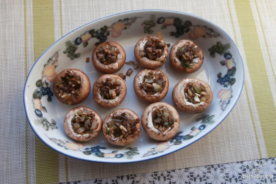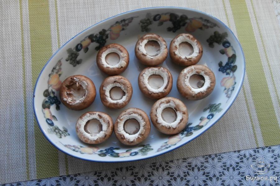 1. У шампиньонов вынуть, чуть прокрутив, ножки, разместить грибы в подходящей форме отверстиями вверх. Чуть посолить внутри шляпок.