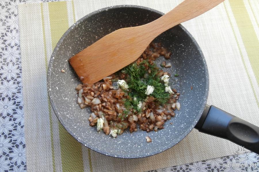 4. Далее, добавить мелко порезанный чеснок, а также, измельченный укроп. Все перемешать, прогреть пару минут.