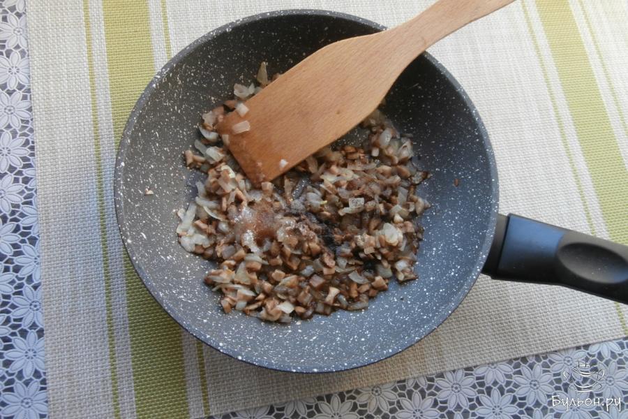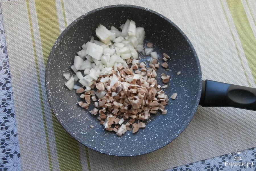 2. Грибные ножки с репчатым луком мелко порезать, поместить в сковороду, влить рафинированное масло.