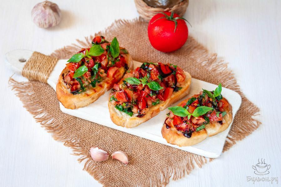 Брускетта - классическая итальянская закуска, которая представляет из себя поджаренные кусочки хлеба с различными начинками. Для придания аромата, обжаренный хлеб присыпают травами, натирают чесноком, сбрызгивают оливковым маслом и бальзамическим уксусом. Начинкой для брускетты может стать все, что найдется в холодильнике - сыры, мясо, ветчина, свежие, маринованные овощи и даже фрукты. Сегодня приготовим один из наиболее популярных вариантов закуски - брускетту с помидорами и базиликом.