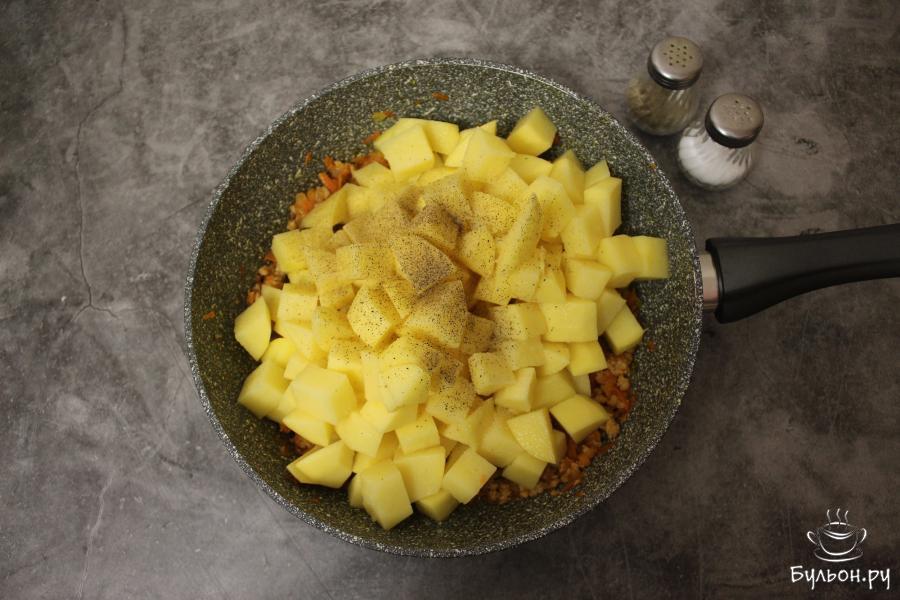 4. Очищенный и нарезанный кубиками картофель выложить в сковороду, поперчить, посолить, влить кипяток и перемешать, закрыть сковороду крышкой. Тушить на небольшом огне в течение 20 минут. Если овощи дают очень мало сока, можно добавить немного воды.