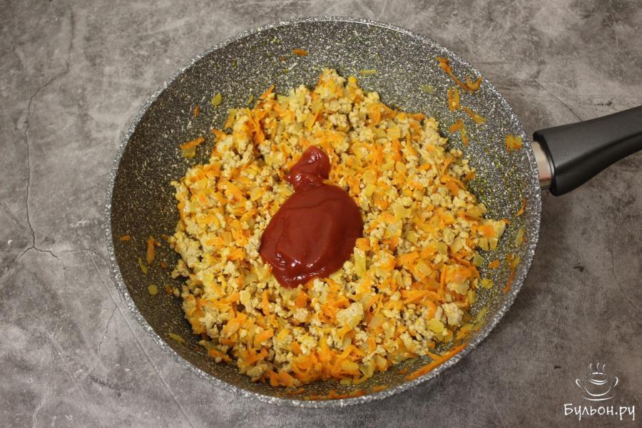 3. Когда в сковородке испариться вся мясная жидкость, добавить томатную пасту, перемешать и потушить еще примерно 5 минут.