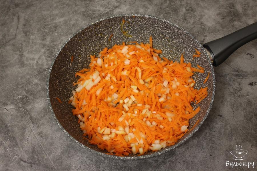 1. Очистить лук и морковь. Лук порезать кубиками, а морковь натереть на крупной терке. На растительном масле, слегка, обжарить до мягкости подготовленные овощи.