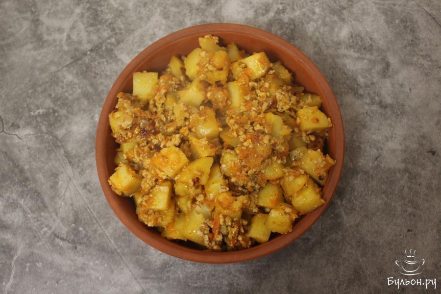 5. Попробывать картофель на готовность. Если картофель мягкий, значит блюдо готово. Разложить тушеную картошку с фаршем по тарелкам и подать к столу.