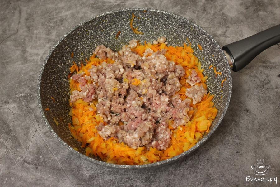 2. Затем выложить к овощам фарш и обжарить его, постоянно разбивая мясные комочки деревянной лопаткой. Зажаривать фарш не надо, его необходимо немного потушить.