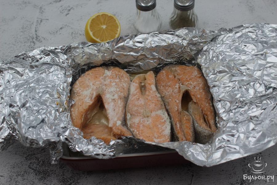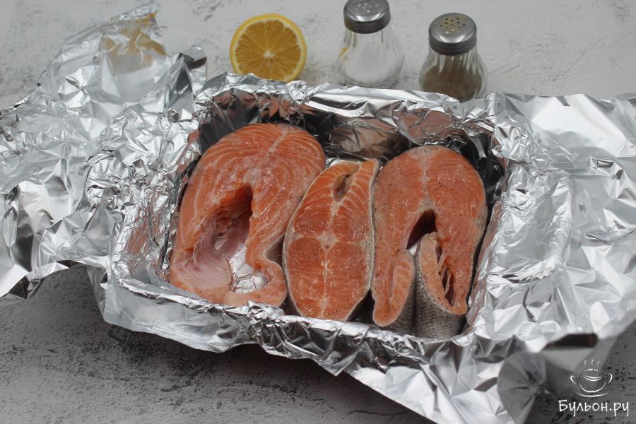 4. В форму выложить лист фольги, на нее плотно уложить подготовленную рыбу, завернуть фольгу герметично.
