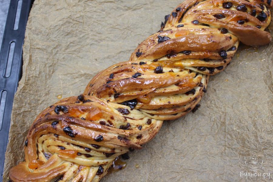 10. Вынуть противень с выпеченным рождественским батоном из духовки и сверху смазать его разогретым, теплым, абрикосовым вареньем.