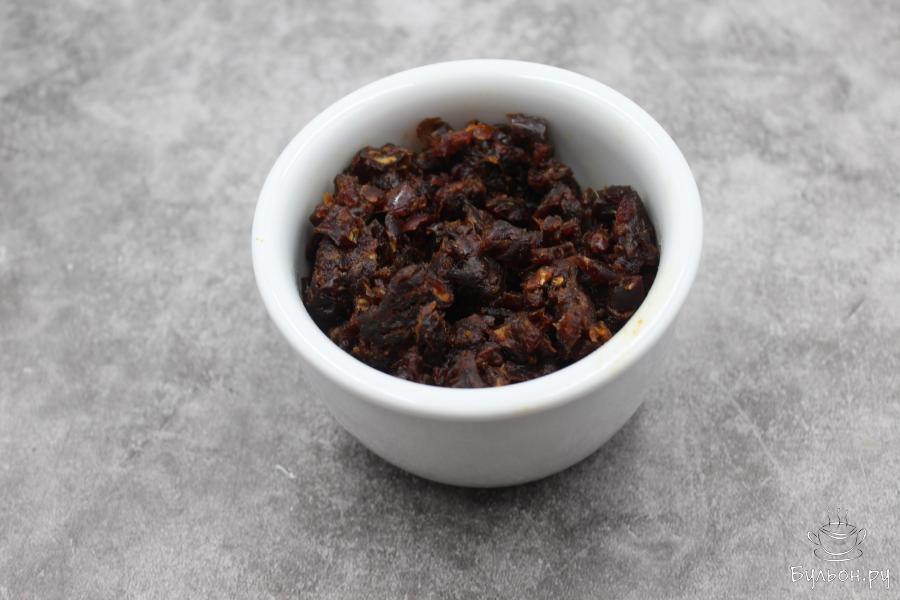 5. Пока подходит тесто, из сушеных фиников извлечь косточки и нарезать их небольшими кусочками. Переложить нарезанные финики в небольшую пиалу, в нее же влить ром и дать финикам напитаться ароматом.
