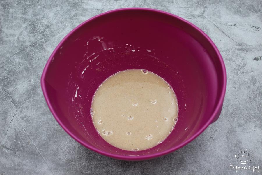 2. В чуть теплой воде растворить живые дрожжи, добавить 2 ст. л. сахара, и дать постоять смеси в теплом месте, примерно 10 минут. На поверхности должны образоваться пузырьки. Затем добавить оставшийся сахар, соль и молотый кардамон, перемешать.
