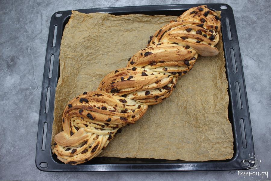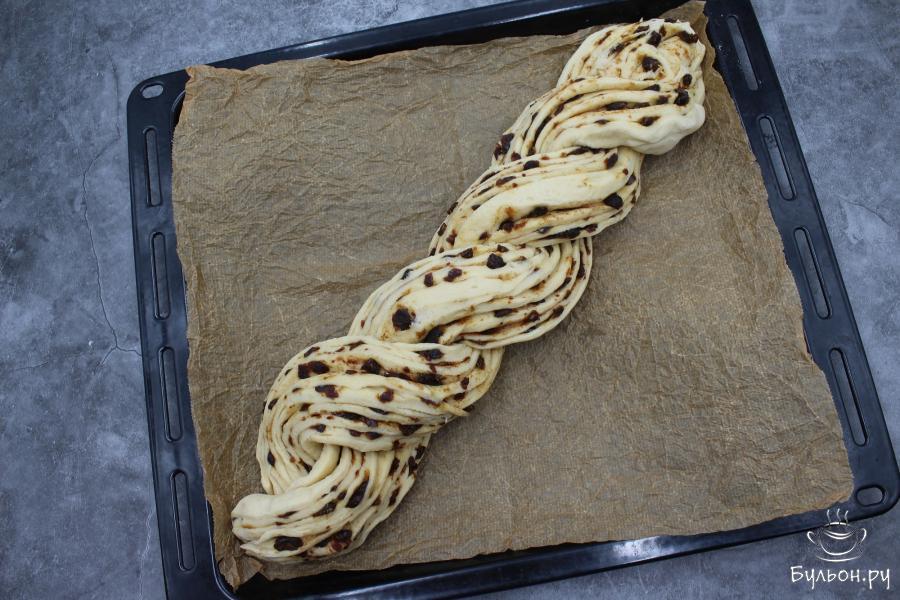8. Скатать пласт в плотный рулет, переложить его на противень, застеленный пекарской бумагой и разрезать его пополам (по длинне). Скрутить получившиеся половинки друг с другом. Накрыть батон полотенцем, дать тесту подняться, минут 15.