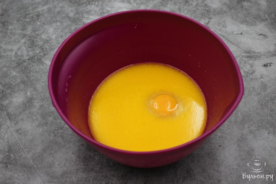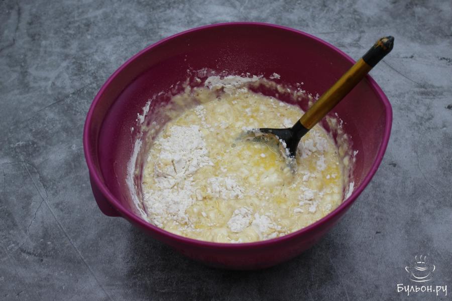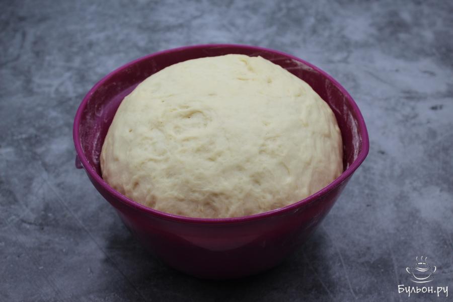 4. Частями всыпать просеянную муку и замесить тесто. Затем сформировать из него шар, переложить в миску, накрыть полотенцем и дать тесту дважды подойти.