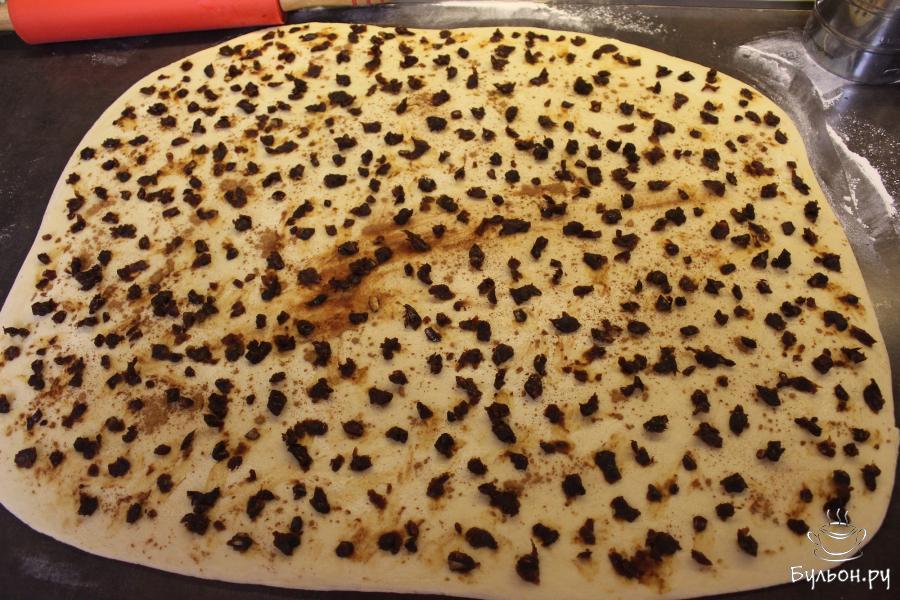 7. Раскатать тесто в прямоугольный пласт. Всю поверхность смазать размягченным маргарином (25 гр.), посыпать молотой корицей и равномерно распределить вымоченные в роме финики.
