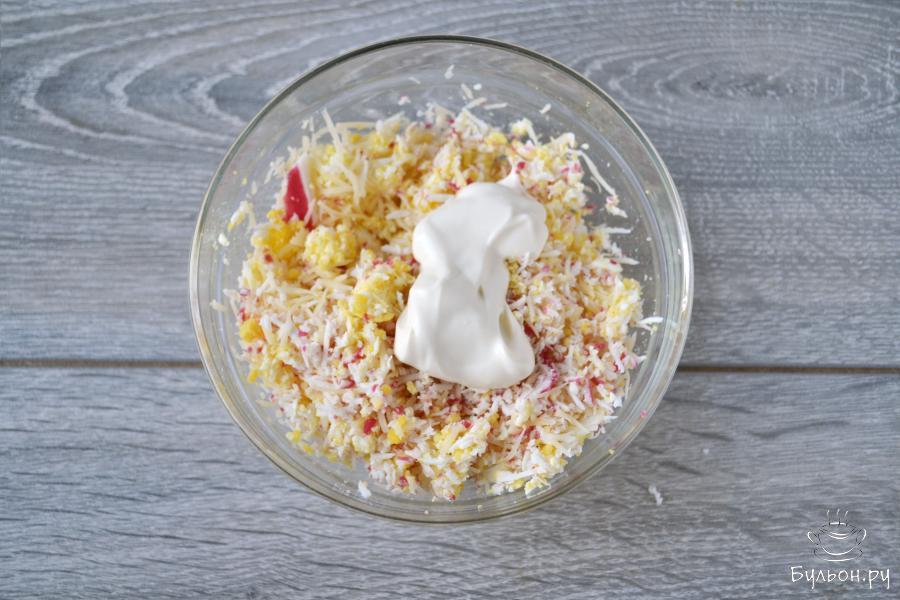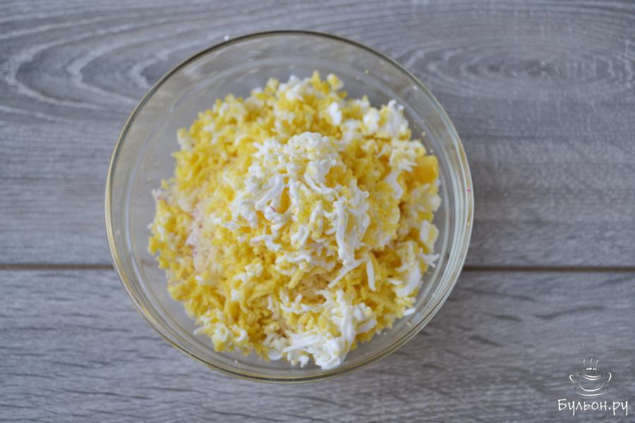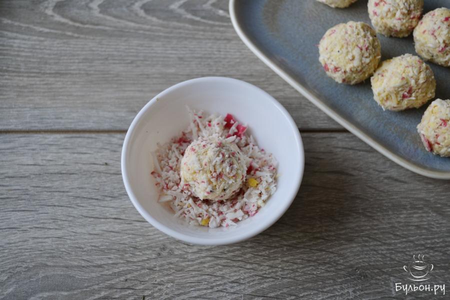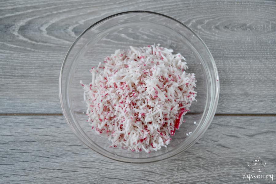 1. Крабовые палочки освободить от упаковки и натереть на мелкой терке. Примерно 1 ст. л натертых палочек оставить для обкатывания шариков.