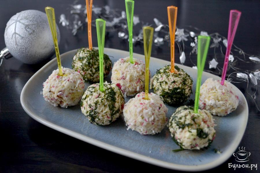 Закуски хорошо украшают праздничный стол. Приготовить закуски не долго и не сложно. И съедаются они, как правило, самыми первыми со стола. Единственное условие, такие закуски нужно готовить перед самой подачей, чтобы они не потеряли своего аппетитного вида и не обветрились. Шарики делаются из натертых на мелкой терке яиц, крабовых палочек и твердого или плавленного сыра с минимальным количеством майонеза.