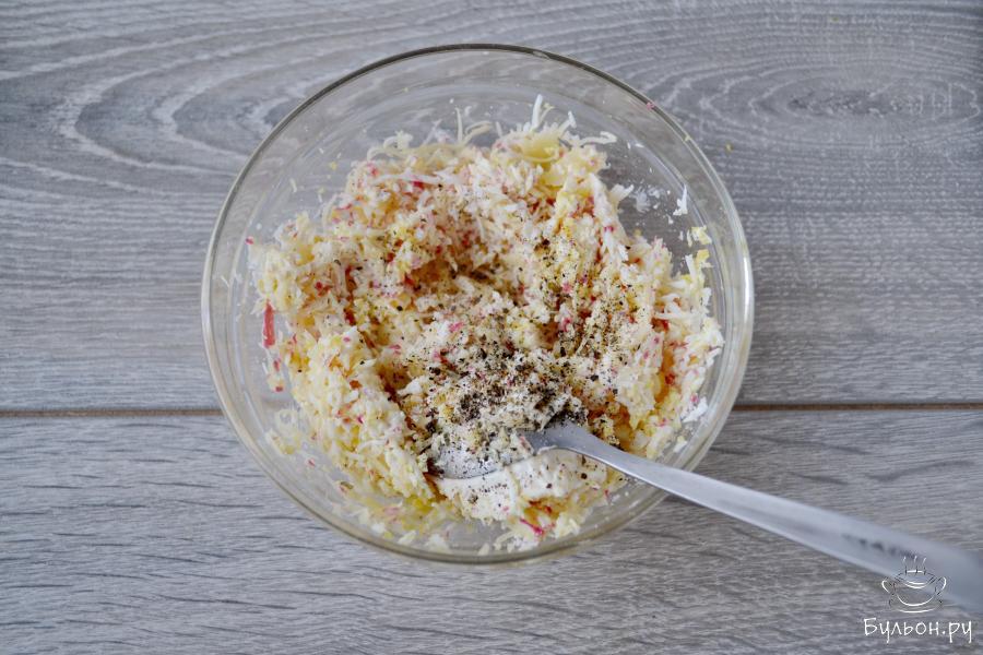 5. В массу добавить черный молотый перец и перемешать. Должна получится пластичная, не жидкая масса, из которой можно сформовать шарики.