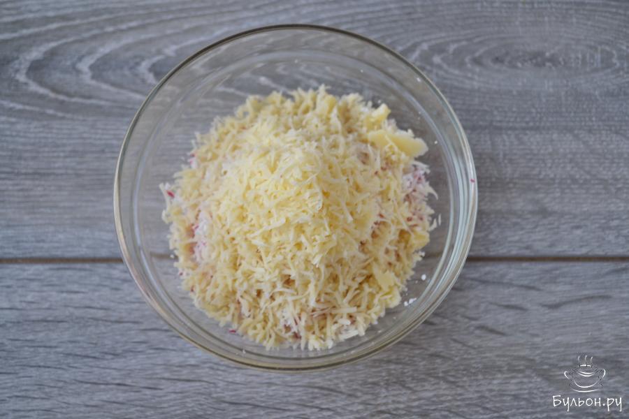 2. В миску, к натертым крабовым палочкам, натереть твердый сыр. Можно взять любой сыр, например, Российский, Пошехонский или взять плавленный сырок хорошего качества.