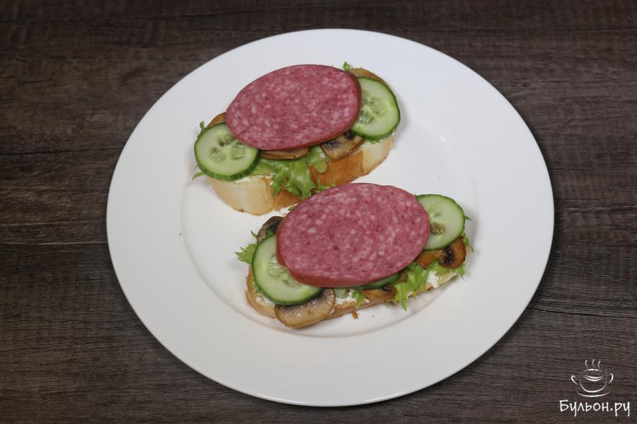 Бетрброды со сливочным сыром, колбасой и овощами - это то, что можно съесть на завтрак, обед, полдник или даже ужин. Получаются очень сытными и довольно каллорийными, поэтому, если хотите позавтракать или перекусить, то одного такого будерброда вам хватит. А вот если нужно плотно поесть, то можно съесть и два. Батон берите очень свежий и лучше использовать немного солоноватый, типа городского или молочного. Приготовив такие бутерброды, вы получите их хрустящие - за счет обжарки батона на сковороде, нежные - за счет использования сливочного сыра, сытные - за счет колбасы и жареных грибов, свежие - за счет огурца и фриллиса, это яркие внешне и на вкус бутерброды.