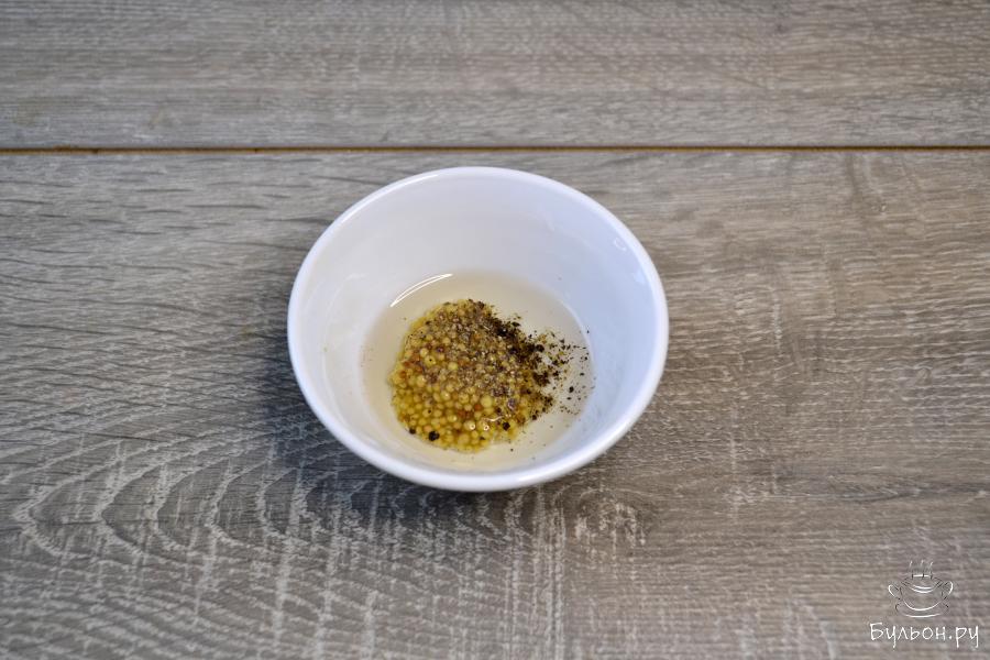5. Приготовить заправку: положить в мисочку горчицу в зернах, влить растительное масло и посыпать черным молотым перцем. Перемешать заправку.