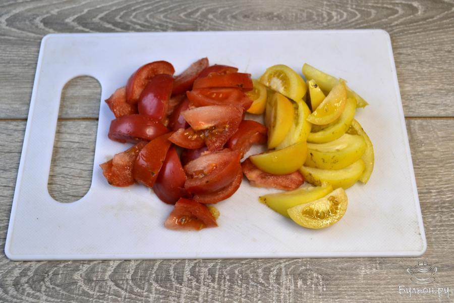 1. Помидоры помыть, нарезать тонкими ломтиками. Помидоры можно взять разные по цвету (красный и желтый). Так салат будет выглядеть более ярко.