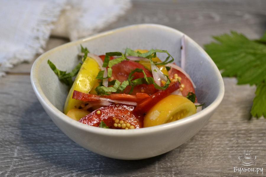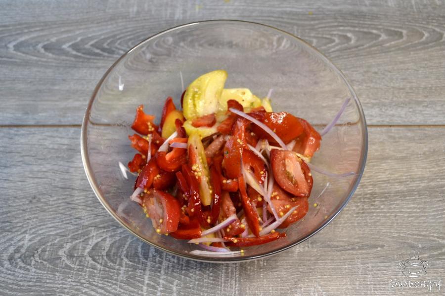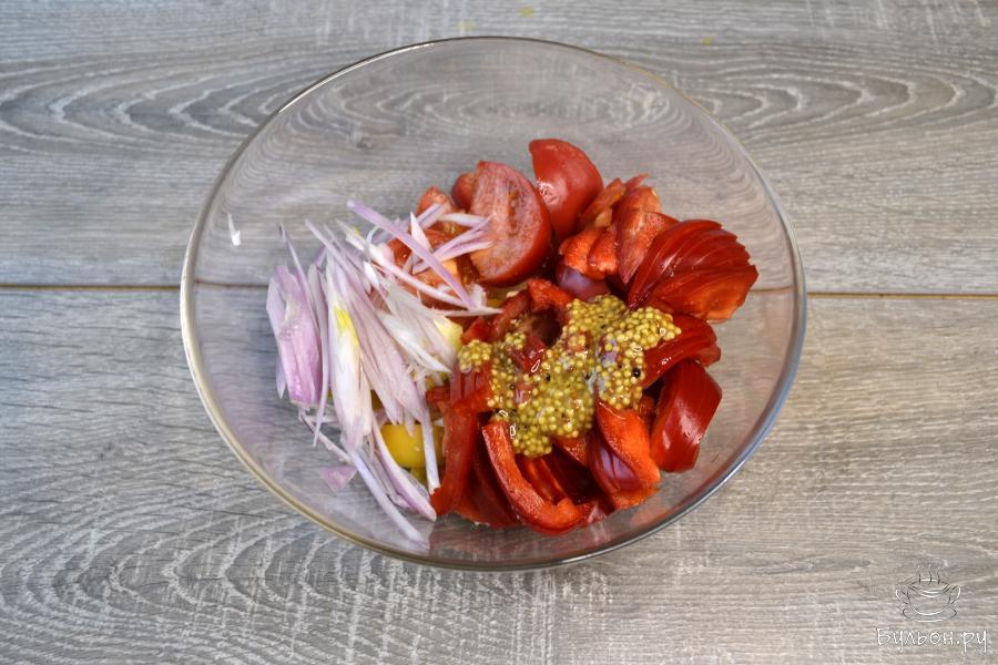 Салаты из свежих овощей - это очень вкусные, доступные, быстрые в приготовлении и полезные блюда. Чтобы привычный салат из помидоров и сладкого болгарского перца порадовал новым вкусом, заправьте его не традиционным майонезом или сметаной. А сделайте заправку из растительного масла с зерновой горчицей и черным молотым перцем. По желанию, можете положить измельченный зубчик чеснока. Салат получился невероятно свежий, аппетитный!