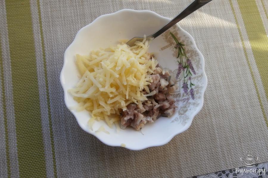 3. Предварительно сваренный в кожуре картофель очистить и натереть, добавить мелко порезанное филе соленой селедки.