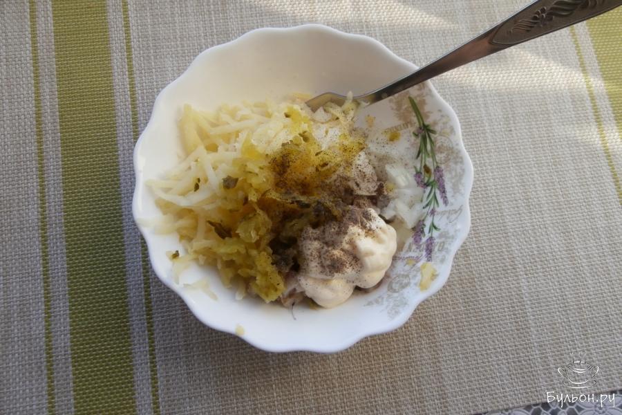 4. Сюда же, добавить натертый и отжатый от жидкости маринованный огурец, мелко порезанный лук, майонез и черный перец.