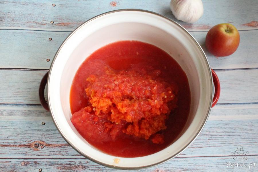 3. Чеснок почистить и промыть, яблоки промыть и убрать семенную коробочку. Перекрутить чеснок и яблоки через мясорубку.