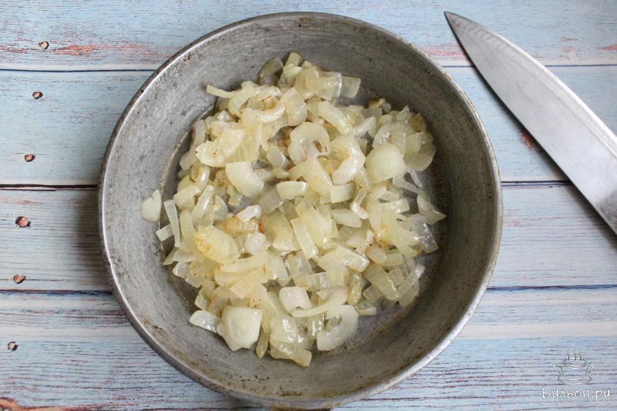 4. Лук почистить, промыть, нарезать не очень крупно. Обжарить лук до мягкости на сковороде с разогретым маслом.