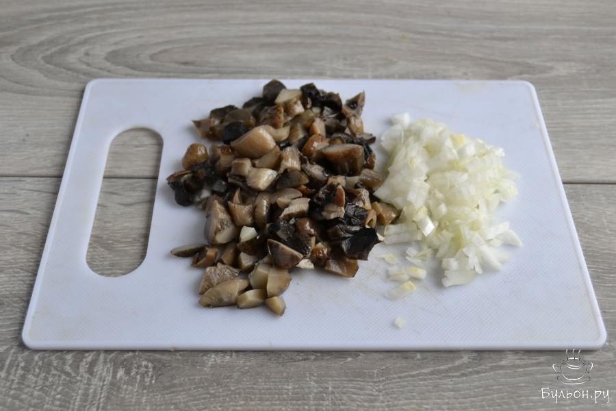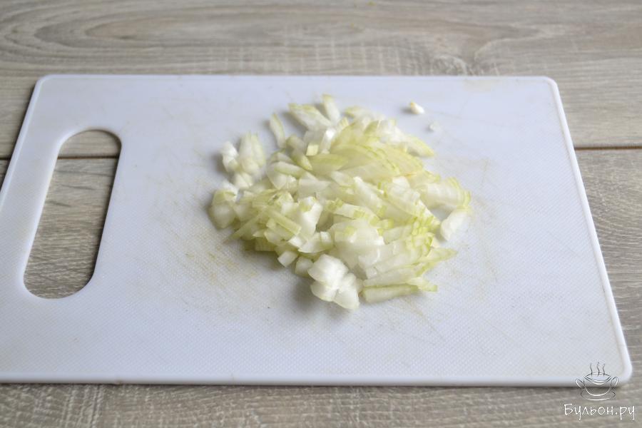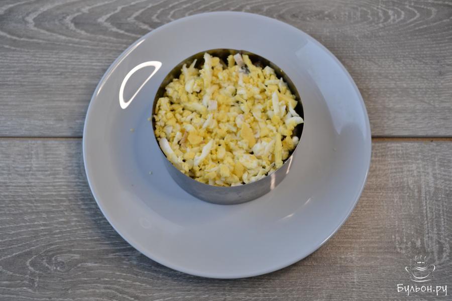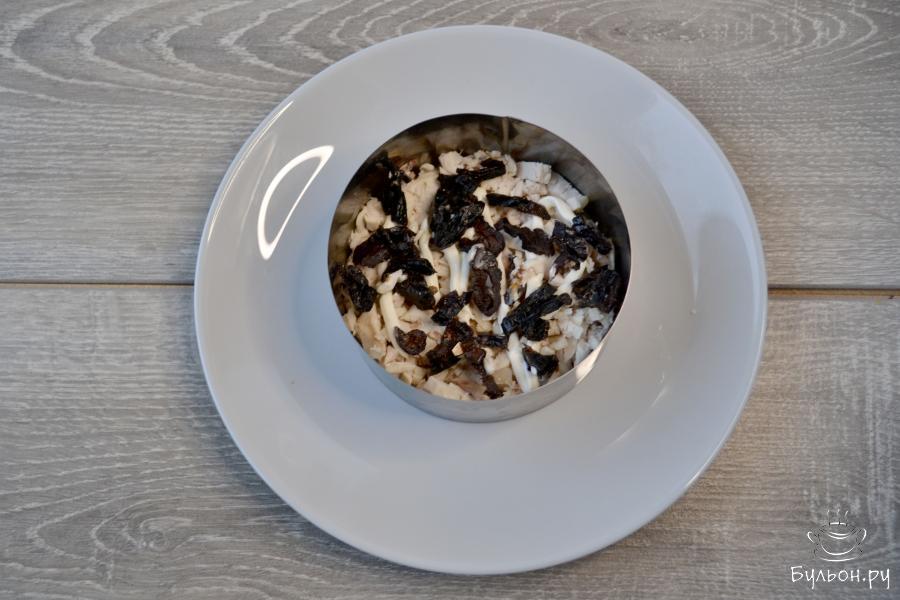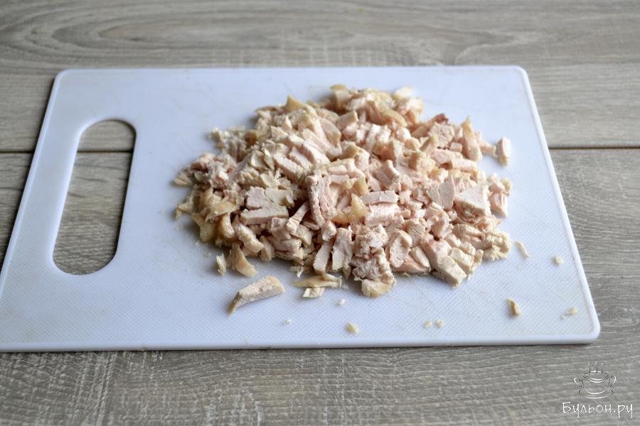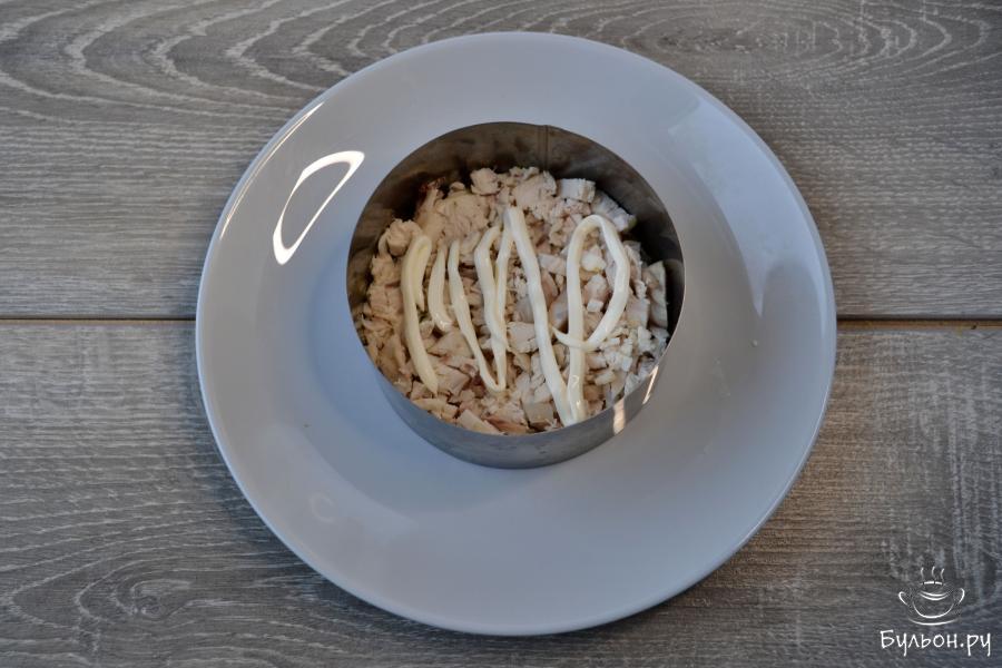 8. Для сбора салата "Блаженство" воспользуйтесь кулинарным кольцом. Первым слоем в кольцо положить нарезанную куриную грудку. На каждый слой наносить тонкую сеточку майонеза.