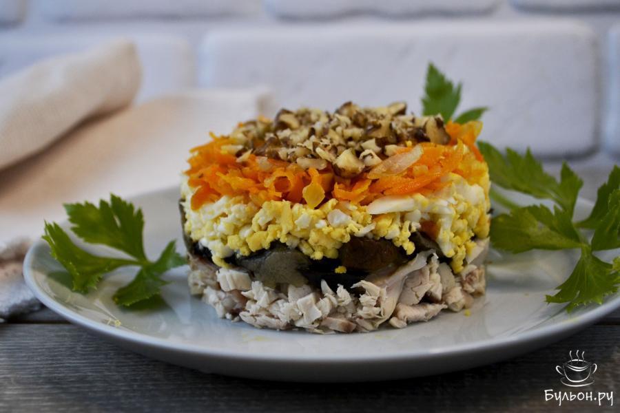 Новый год приближается. Каждая хозяйка уже заранее задумывается о том, какие блюда будут на новогоднем столе. А чтобы праздничное меню было удачным на все 100%, нужно уже сейчас попробовать какие-то новые рецепты. Салат "Блаженство" покорит вас своим вкусом. В нем прекрасно сочетаются все ингредиенты: курица хорошо гармонирует с грибами, сладкая морковь с вареными яйцами, а вдобавок чернослив и грецкий орех. Настоящее блаженство вкуса. Майонеза наносите немного, чтобы он не перебил вкус основных продуктов.