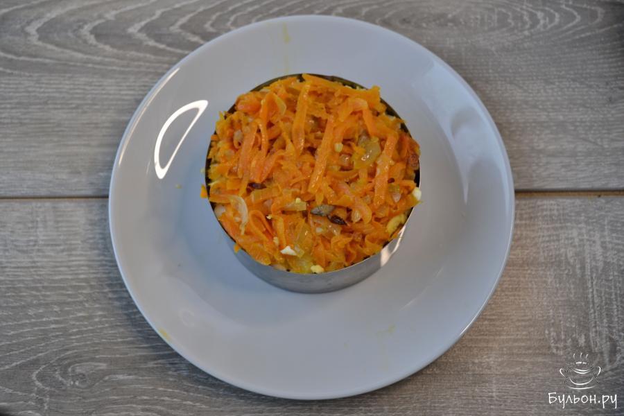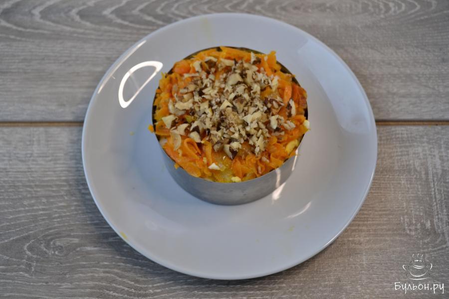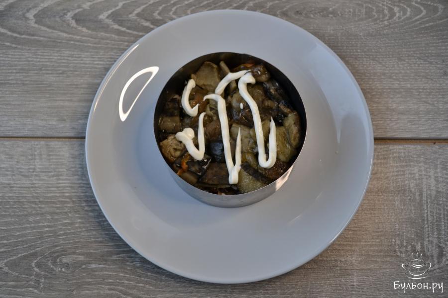 14. Дать салату настоятся 1-2 часа, затем аккуратно снять кольцо и подать к столу. Приятного аппетита!
