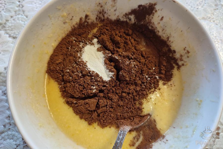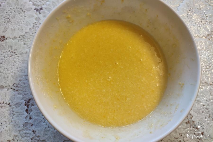 1. Холодное сливочное масло растереть ложкой с сахарным песком и ванилином. Влить растительное масло и вбить яйцо. Размешать венчиком до однородной массы.