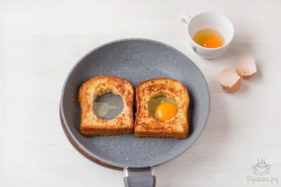 7. Разбейте яйцо в неглубокую чашку. Затем осторожно, стараясь не повредить целостность желтка, влейте яйцо в отверстие в хлебном мякише.